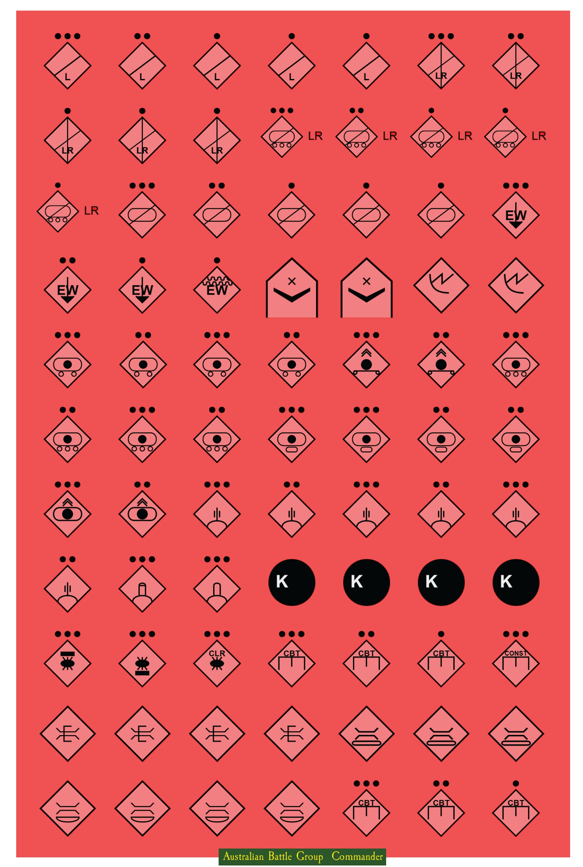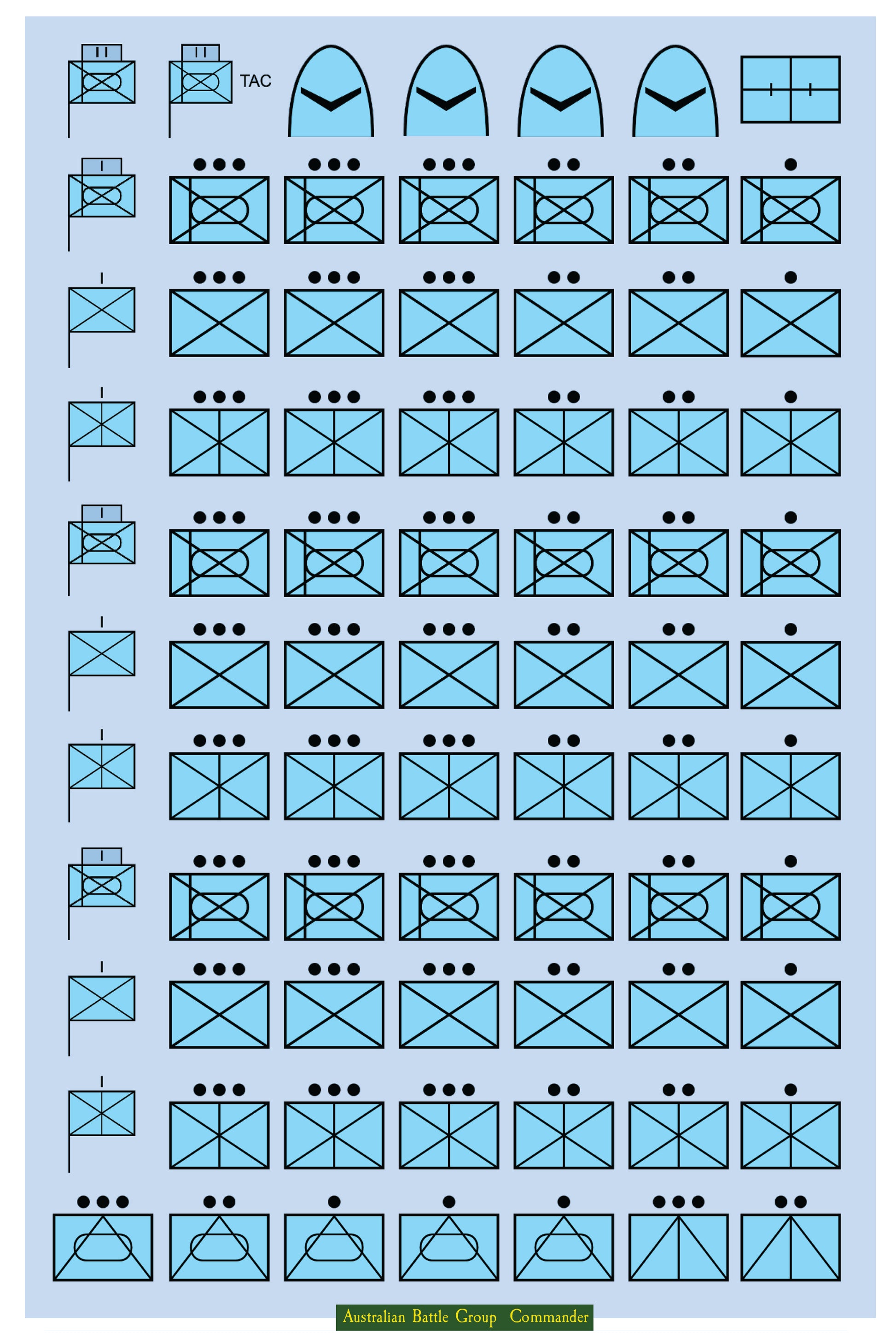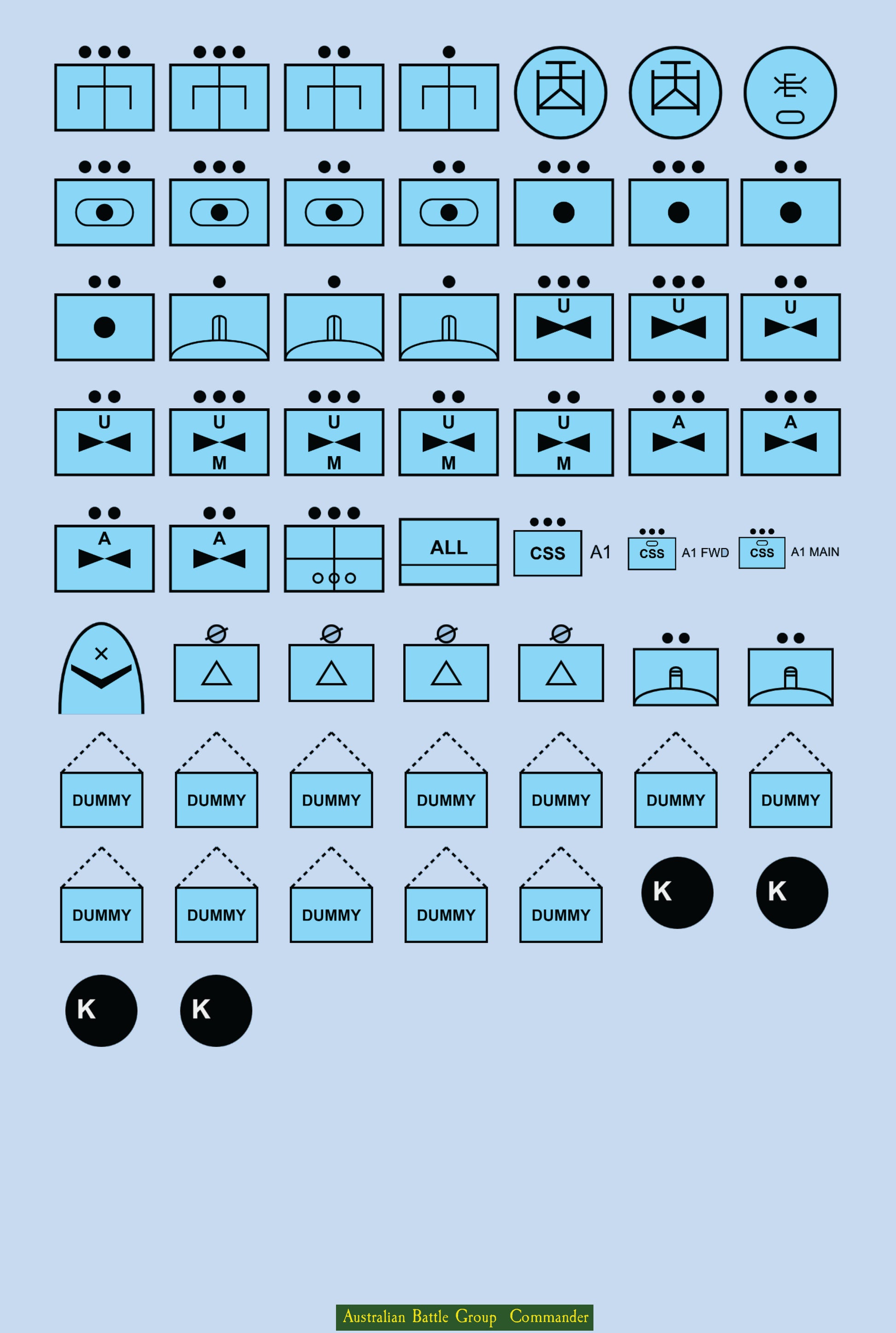 Set contains 8 sheets of MDF chits. Contains sheets for friendly and opposing forces as well as generic game tokens. The back of the sheets is printed with a camo pattern.