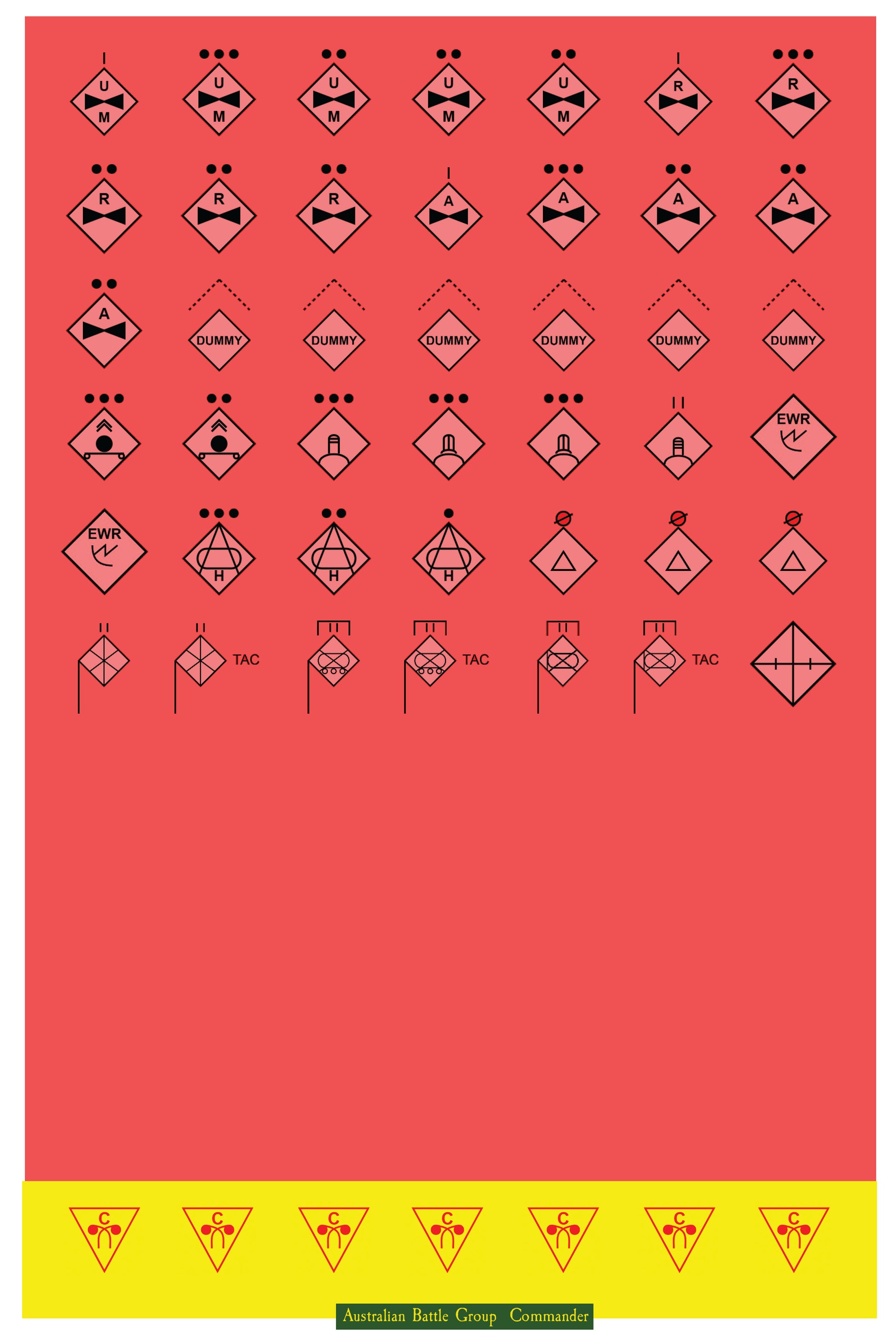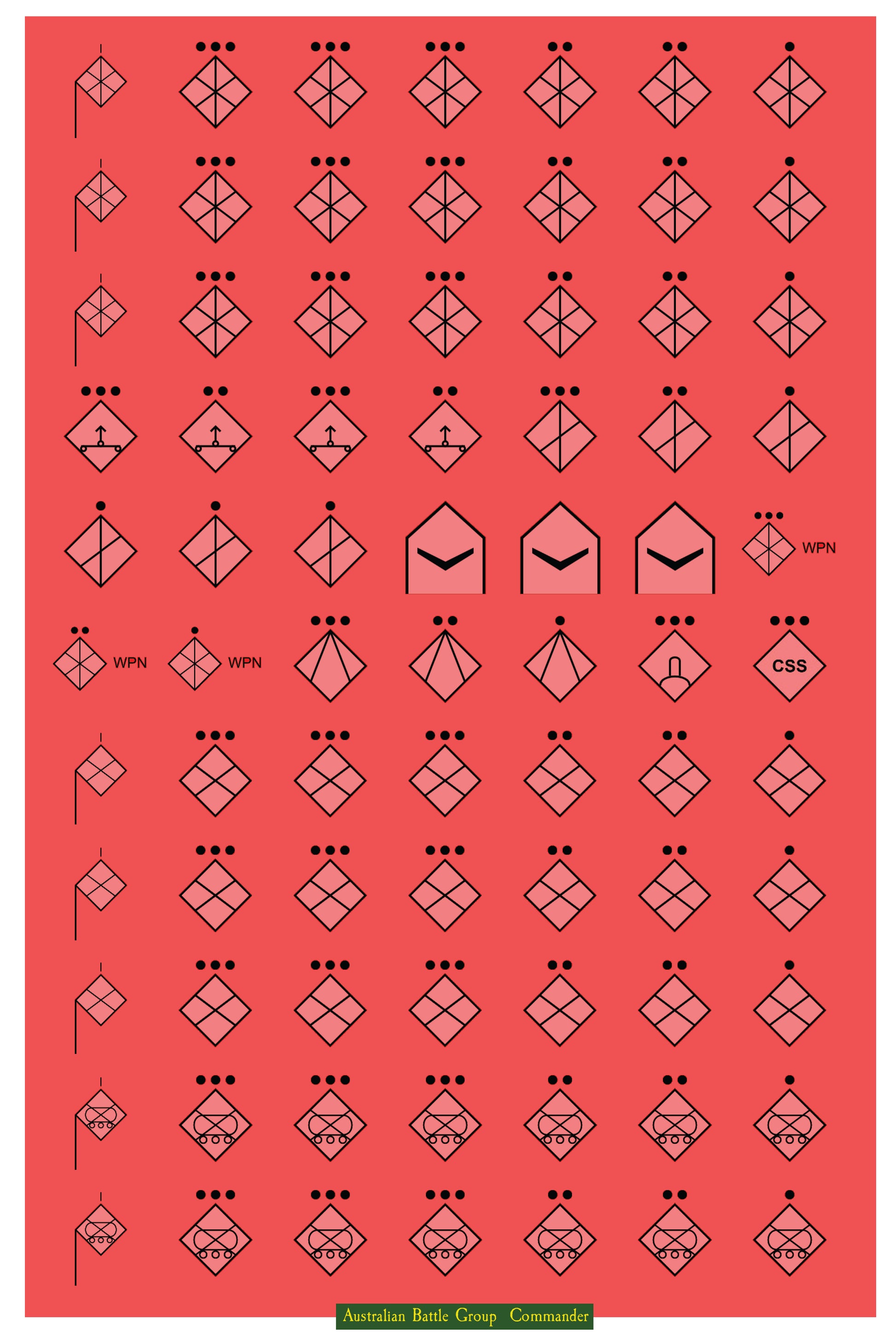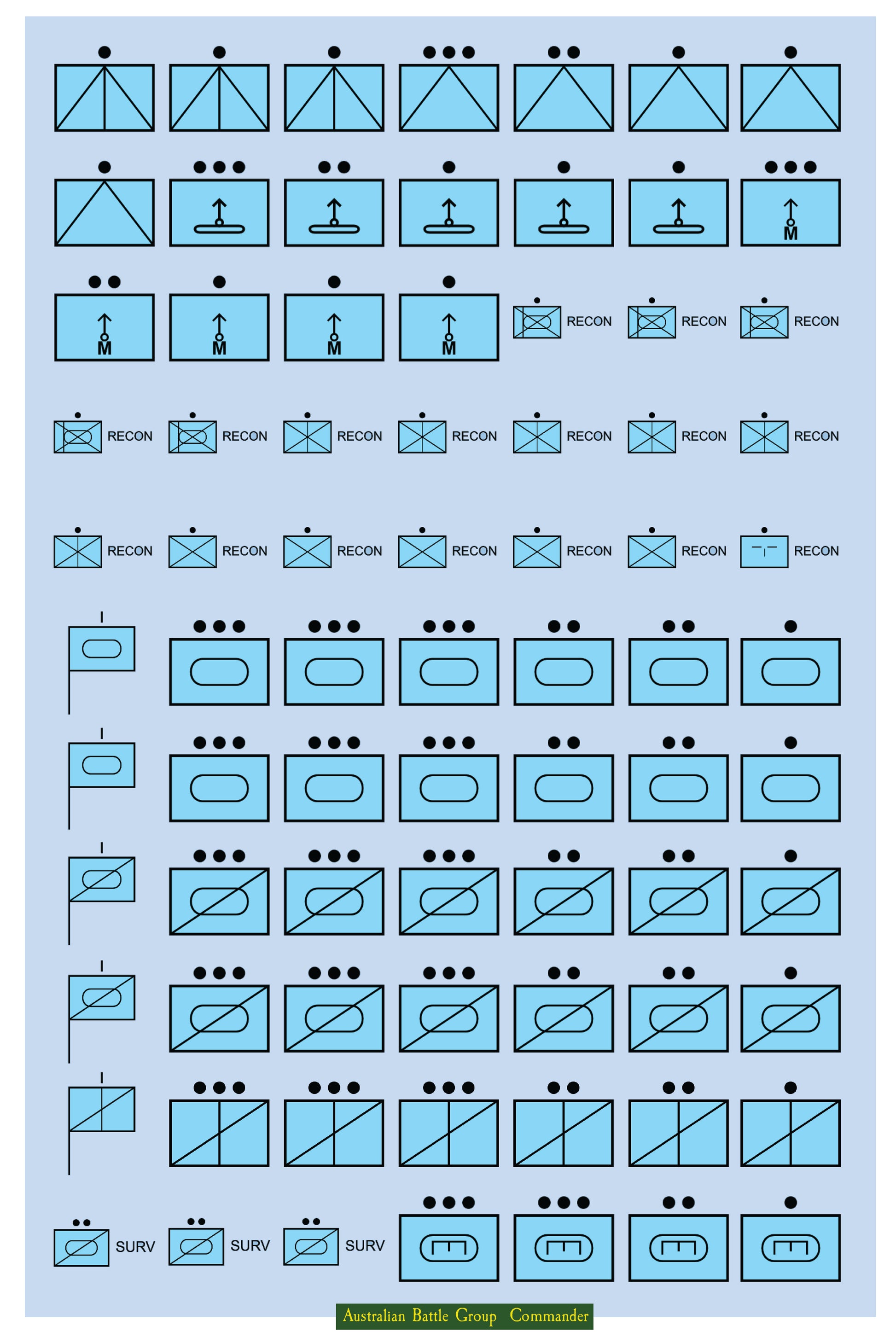 Set contains 8 sheets of MDF chits. Contains sheets for friendly and opposing forces as well as generic game tokens. The back of the sheets is printed with a camo pattern.